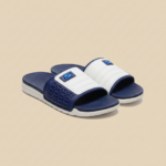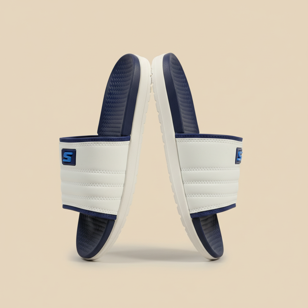 The upper is crafted from high-grade white synthetic leather with soft foam padding and architectural quilting, accented by a signature blue “S” emblem. The contrasting navy footbed and white strap offer a clean, minimalist aesthetic that fits perfectly into any high-end casual wardrobe. With a textured footbed for a non-slip grip and a lightweight build, these slides allow you to move with confidence and ease.